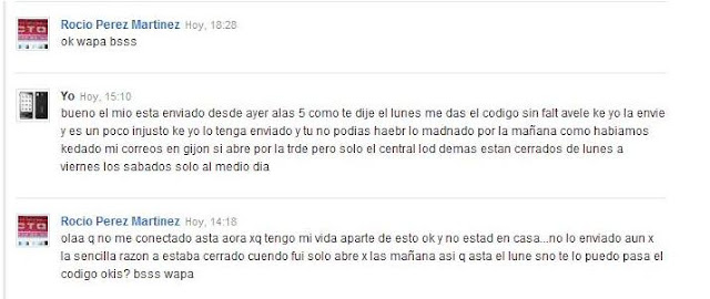 Lucia envio su paquete en la fecha acordada, pero rocio no lo hizo, le dio la excusa de que no pudo o algo asi, os pongo capturas de sus privis y copio la conversacion.
