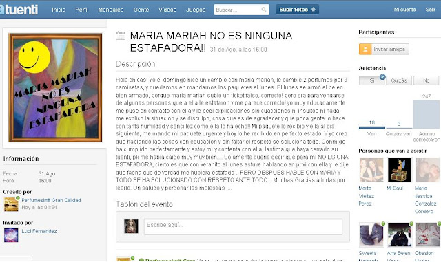 Dado que una chica ha creado un evento defendiendola, ha puesto comentarios aqui, y visto que algunas chicas ni leen las cosas, voy a ir poniendo las cosas tal como suceden en el evento (lo que tenga que ver con el tema), por supuesto por mi propio bien sobre todo y el de las demas, porque yo solo intento ayudar a que las estafadoras desaparezcan ya, como sabeis, el porcentaje de estafadoras supera al de chicas legales.LEED DE ARRIBA A ABAJO, VA POR ORDEN.